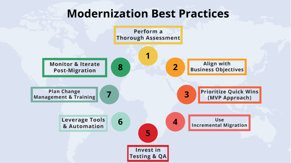 While every legacy modernization project is unique, there are proven best practices that increase the likelihood of success. These practices help organizations navigate the complexities and avoid common pitfalls: